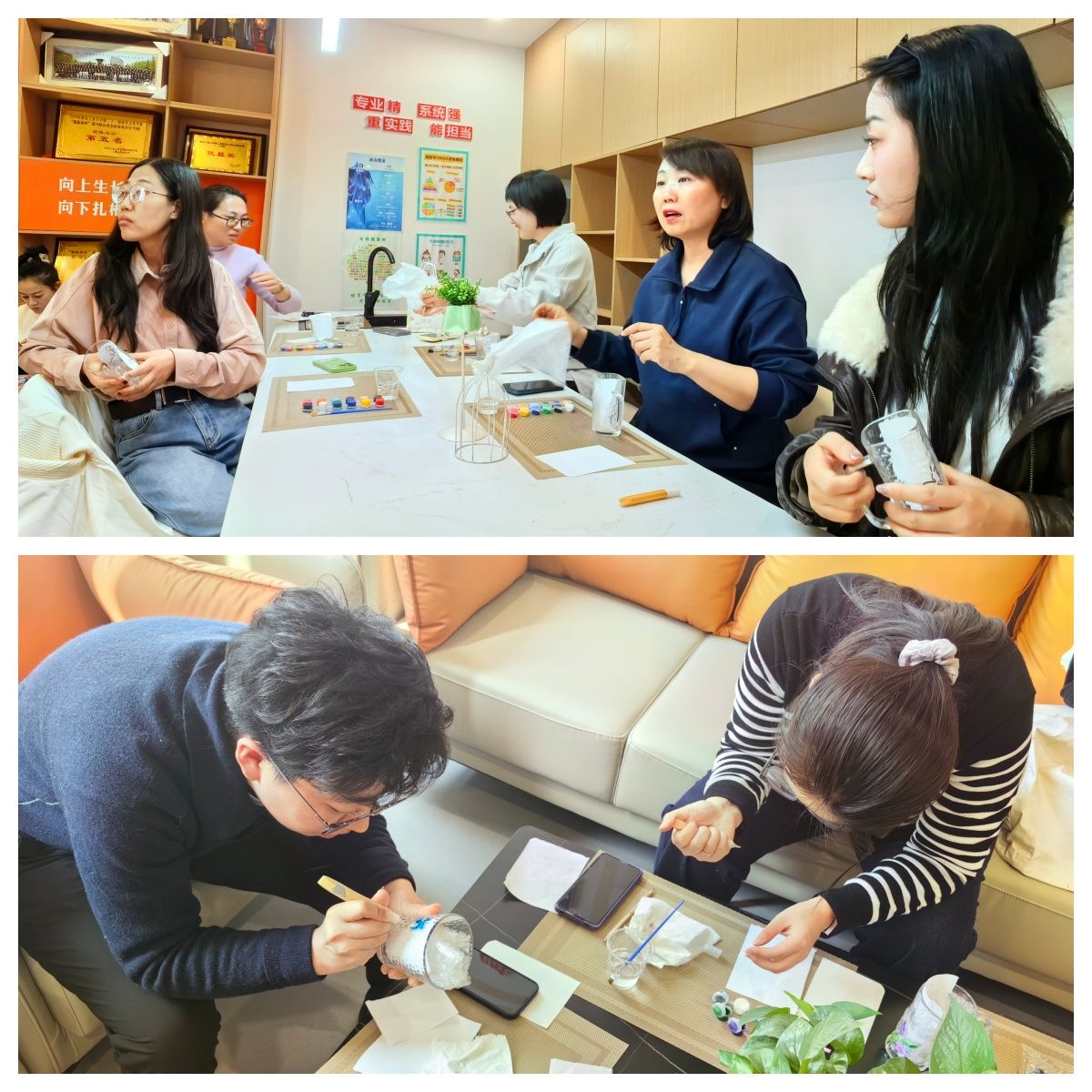 活动伊始,专业老师为大家详细讲解了手绘玻璃起源历史发展和制作方法。从勾线笔的握法、颜料的调和比例,到图案的设计构思,细致的讲解让原本对绘画略感陌生的老师们逐渐放下顾虑,眼中闪烁起跃跃欲试的光芒。随后,大家纷纷拿起画笔,投入到沉浸式的创作中。活动现场气氛热烈而温馨。透明的玻璃杯在画笔下逐渐焕发生机:有的老师以小动物为主形象,展示了个人温柔可爱的一面;有的老师以几何图形为灵感,用严谨的线条勾勒出充满数学美感的抽象图案;有的描绘出春日盛景,嫩绿的枝叶与绽放的花朵跃然杯上,寓意着新学期的蓬勃生机。大家相互交流配色灵感,分享创作心得,欢声笑语中,一件件独一无二的艺术品应运而生。