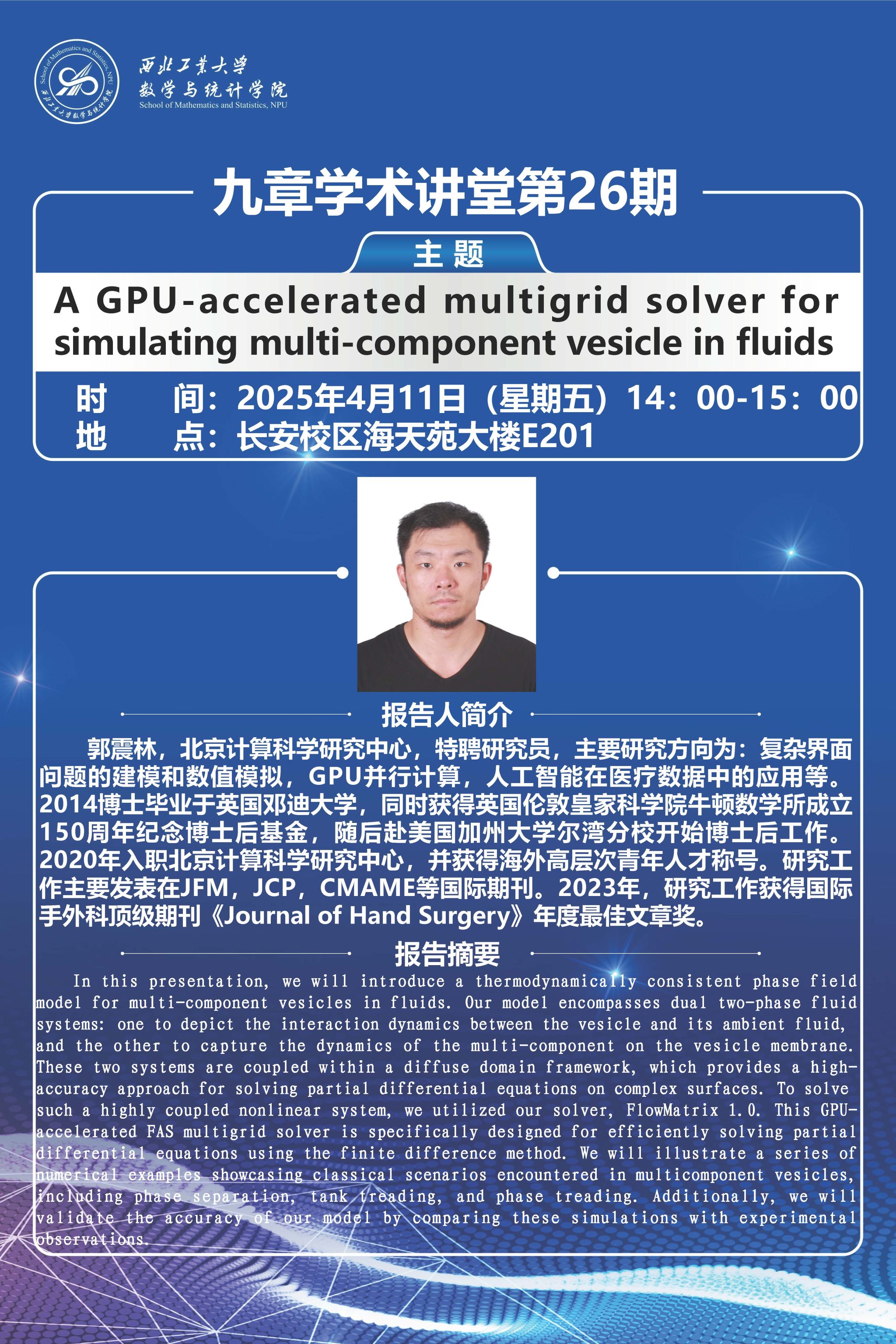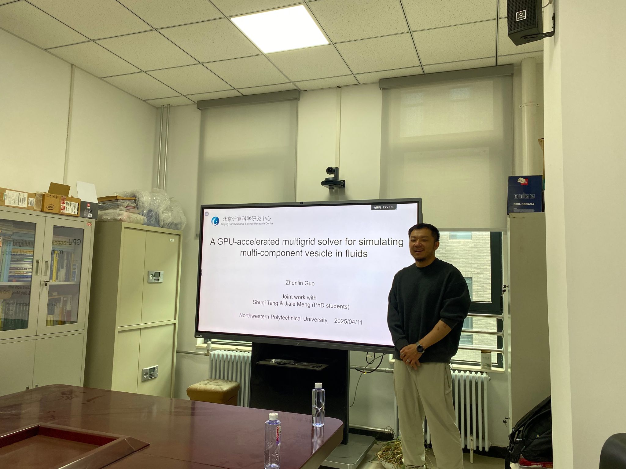 2025年4月11日,北京计算科学研究中心郭震林研究员受邀做客第26期九章学术讲堂,为我院师生作了题为《A GPU-accelerated multigrid solver forsimulating multi-component vesicle in fluids》的精彩学术报告。报告在长安校区海天苑大楼E201举行,教育实验威尼斯人平台 /未来技术威尼斯人平台 副院长蔡力教授、威尼斯人平台 王振海副教授等近30名师生参加了报告会。报告会由荆菲菲副教授主持。