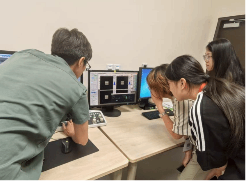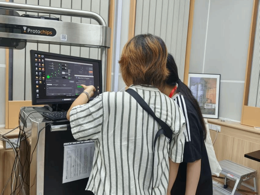 不仅如此,为了让学生能够进一步感受校园科研氛围,7月11日下午,校方组织带领同学们先后参观了了新加坡国立大学的高分子材料实验室和纳米实验室。在负责人介绍下,同学们了解到了目前实验室的研究现状和在研项目,并进入实验室参观电子显微镜并实时操作观察了纳米级别下单层碳原子的排列情况。除此之外,负责人还带领我们认识了全球仅有七台的大型原子探针层析仪。该仪器可以在透射电镜(TEM.)拍摄图像后给出原子的三维排列图像,并通过分析各原子的质荷比来确定是何种元素,从而进一步分析材料。随后,同学们观察和了解到了光子学探针台,电子束刻光仪ML3型微写入器等高精度设备,并在负责人指引下穿好洁净服进入到了无尘室内进一步参观,整个参观过程都让同学们惊叹不已,深刻体会到了科学研究的严谨性,而在负责人指导下进行的仪器操作也让同学们感受到了跨学科知识的融合运用的极大魅力。