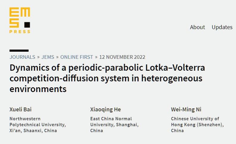 近日,威尼斯人平台 分析与几何研究团队副教授白学利与华东师范大学何小清教授、香港中文大学(深圳)倪维明教授合作在带有时间周期Lotka-Volterra竞争系统解的稳定性理论研究方面取得突破,研究结果形成的55页论文“Dynamics of a periodic-parabolic Lotka-Volterra competition-diffusion system in heterogeneous enviroments”在数学综合顶级期刊Journal of the European Mathematical Society在线发表。这是本年度国内学者在该刊发表的第5篇论文,也是我校首次在该顶级期刊发文。