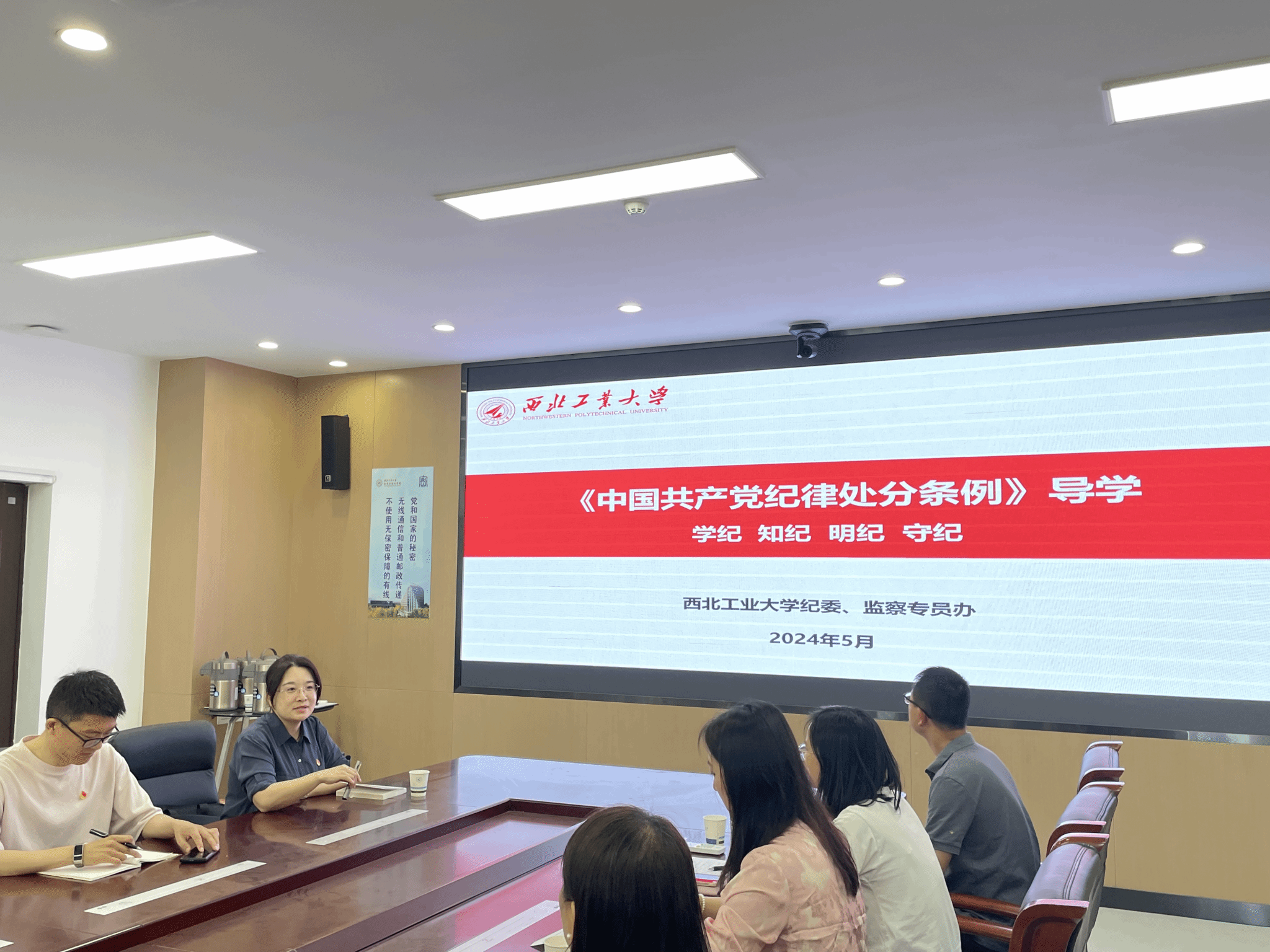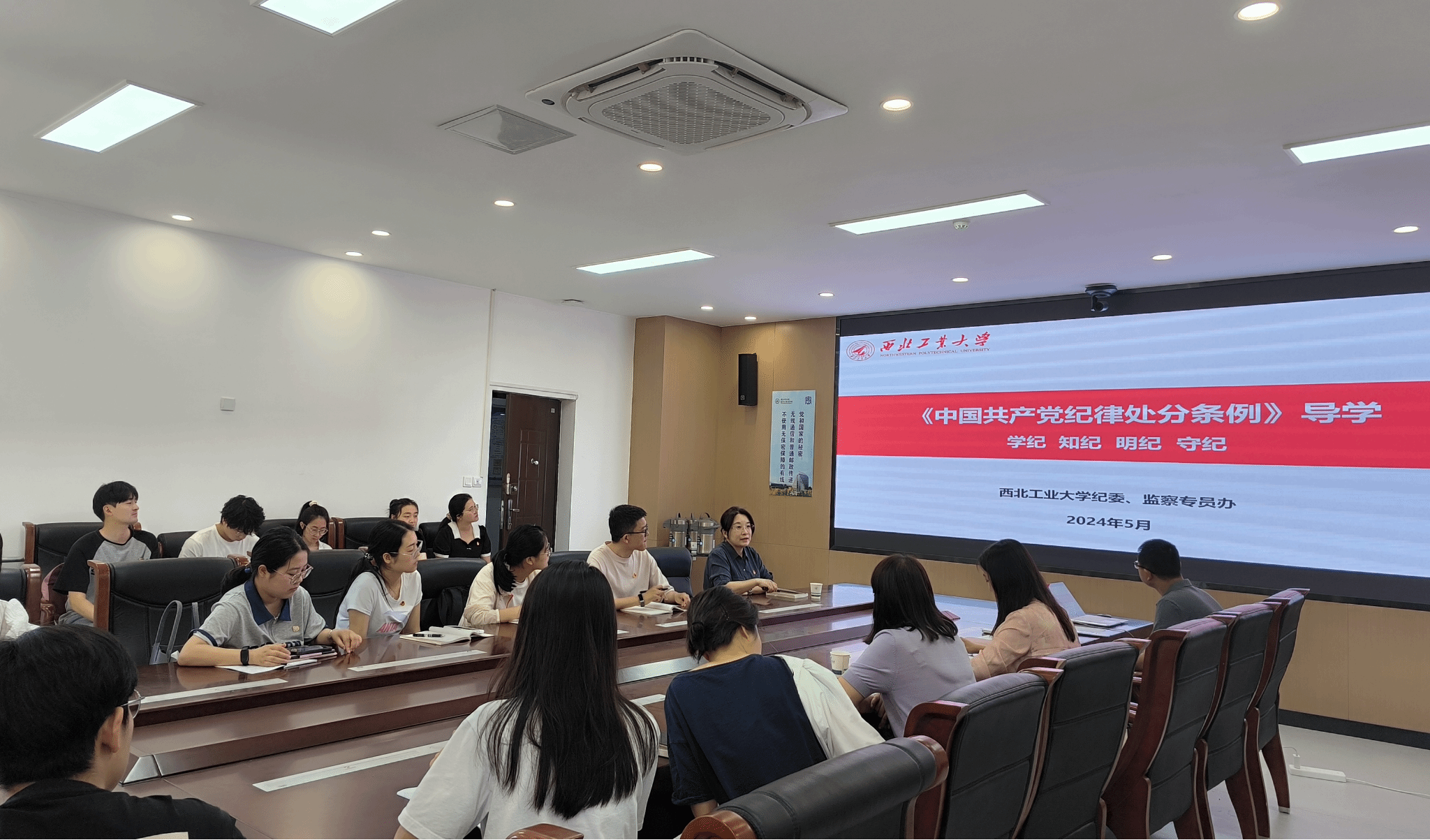 为全面深化党纪学习教育工作,加强党员干部对党规党纪的了解掌握,进一步推动学生学条例、明纪律、坚底线,2024年5月21日,威尼斯人平台 邀请纪检监察机构第二纪检监察室主任王莹老师开展了《中国共产党纪律处分条例》导学专题党课,威尼斯人平台 党委书记王莉、副书记张莹、组织员南剑波、学工秘书曹立帆及全体学生党支部书记和组织委员参与本次学习。