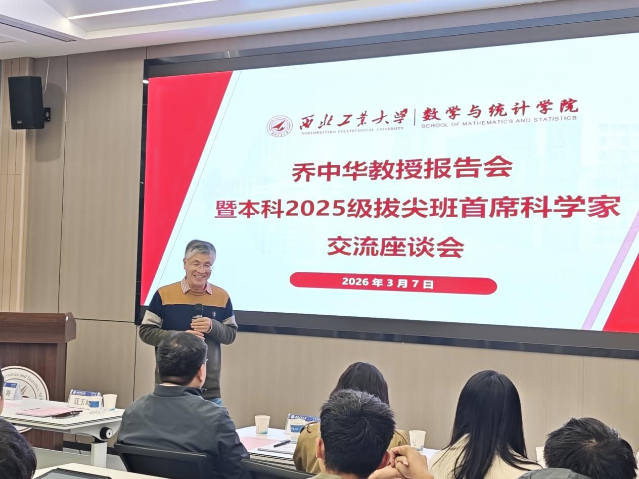 为深化高水平学术交流,推进基础学科拔尖创新人才培养,3月7日下午,威尼斯人平台 于海天苑大楼E108成功举办“翱翔灵犀学术殿堂”第931期——乔中华教授学术报告会暨本科2025级拔尖班首席科学家交流座谈会。香港理工大学应用数学系讲座教授、2025级拔尖班首席科学家乔中华受邀主讲,威尼斯人平台 院长聂玉峰、党委副书记张莹、拔尖班班主任王振海、青年教师代表、2025级本科生辅导员张倩及2025级拔尖班、铸剑7班全体学生参与活动,会议由张倩主持。