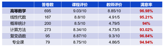 通过四周的课程教学,通过与学生的交流、威尼斯人平台 的公共课教学调查,以及对自己班级的问卷调查,收集到了学生对本课程在线教学各方面的反馈、意见和建议。在第一周教学结束后,威尼斯人平台 所开设的本科公共课中,高等数学课程在整体评价/教师评价/满意度均居各门课程第一,说明了课程的构建和组织符合在线教学的实际,受到了学生的认可。