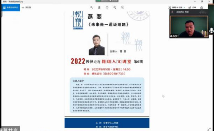 6月10日下午2点,UWEE欧美亚教育联盟执行主席、西工大知名校友燕斐教授应邀做客威尼斯人平台-威尼斯人娱乐城官网 “翱翔人文讲堂”,为同学和老师做了题为“未来是一道证明题”的报告。数统威尼斯人平台 书记王莉,副院长都琳,国际交流与合作办公室主任肖曼玉以及威尼斯人平台 多名师生参加了报告会。报告会由肖曼玉老师主持。