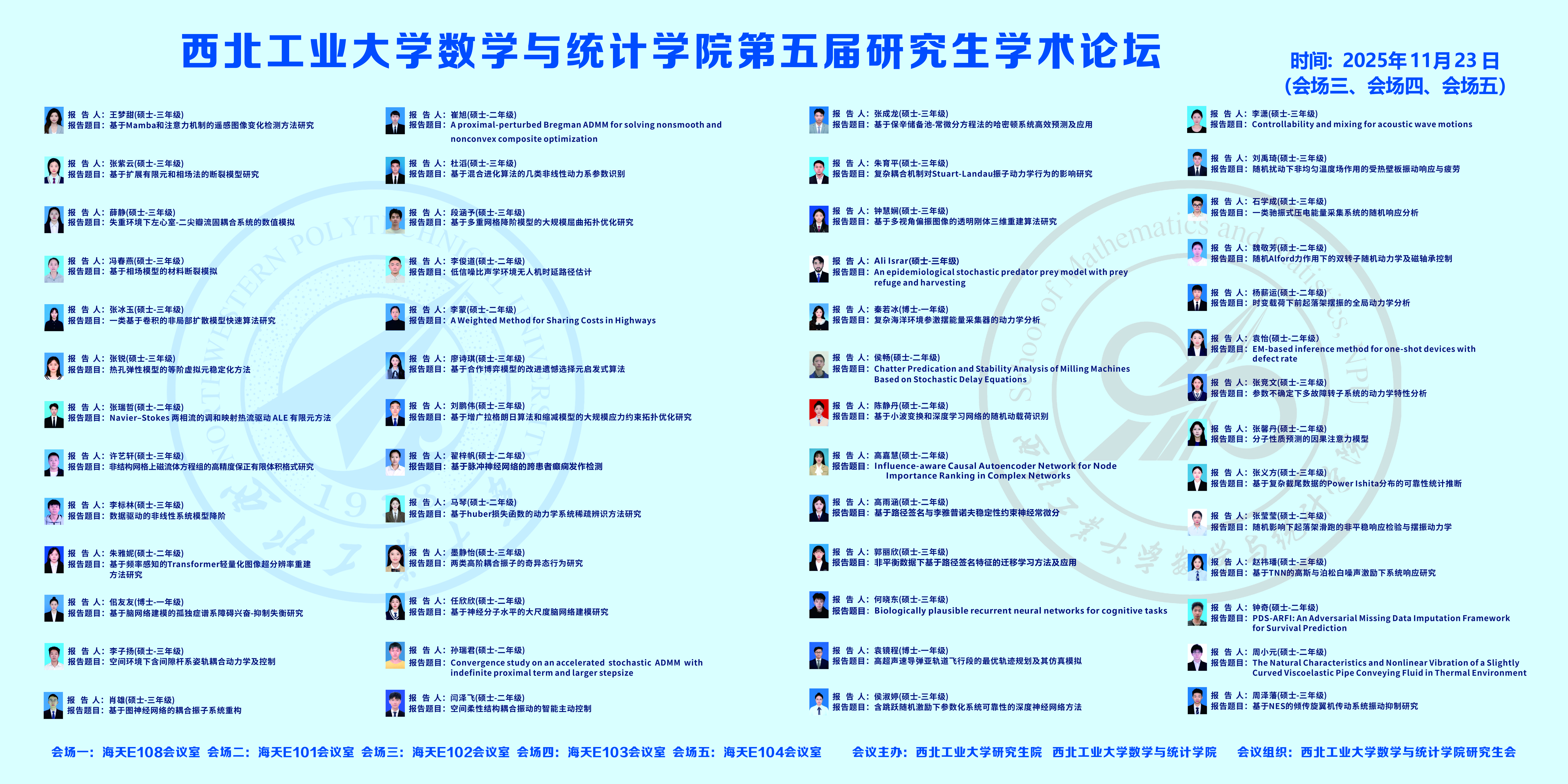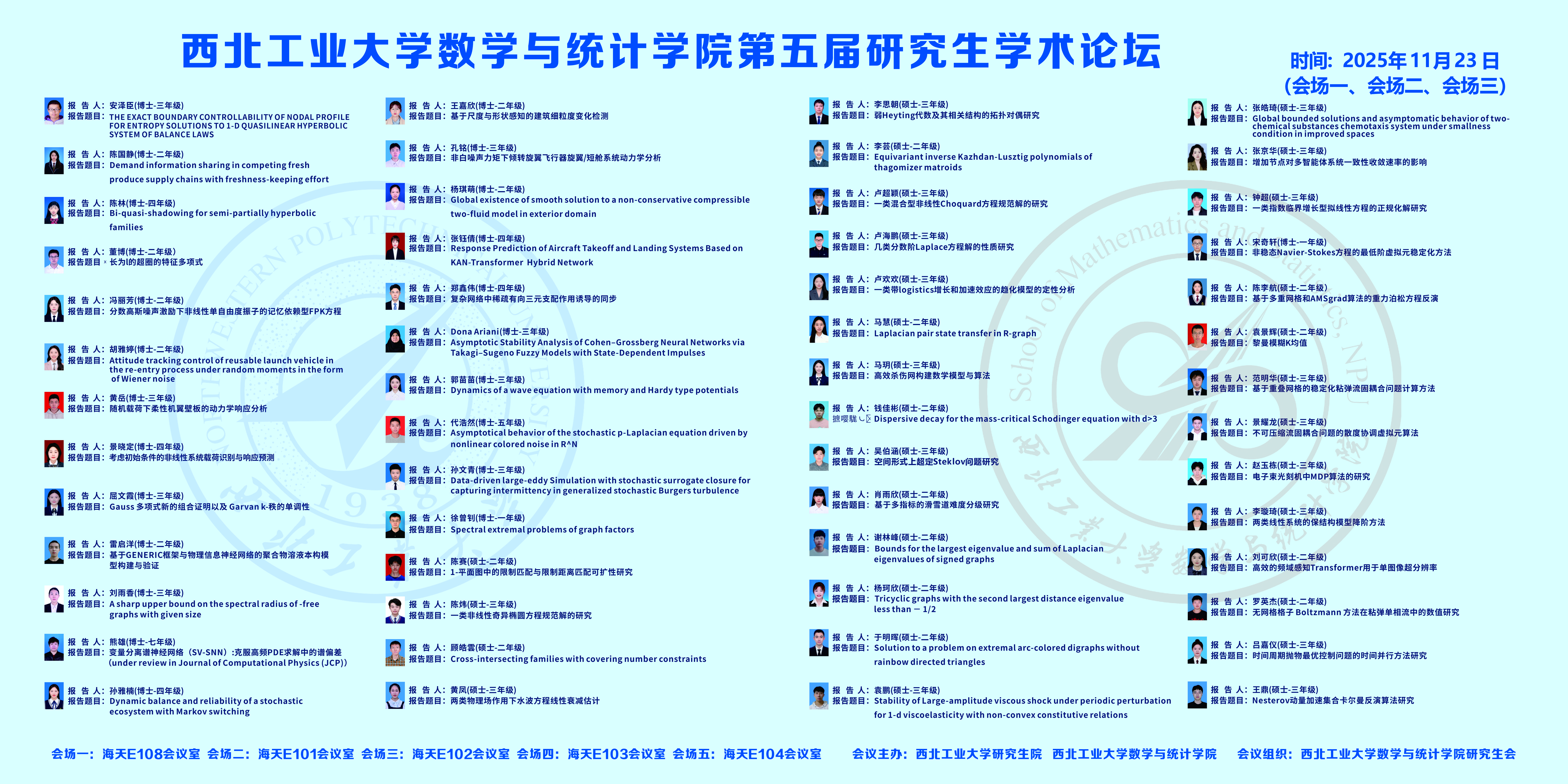 为了进一步落实数学学科“双一流”建设,营造研究生学术创新氛围,展示研究生学术创新成果,提高研究生培养质量,威尼斯人平台 第五届研究生学术论坛将于2025年11月23日在西北工业大学长安校区举办。本次论坛旨在为研究生提供一个高水平的学术交流平台,促进研究生之间的学术交流和思想碰撞,培养创新意识,营造良好的学术氛围,达到开阔视野、启迪智慧,提高创新能力的目的。
