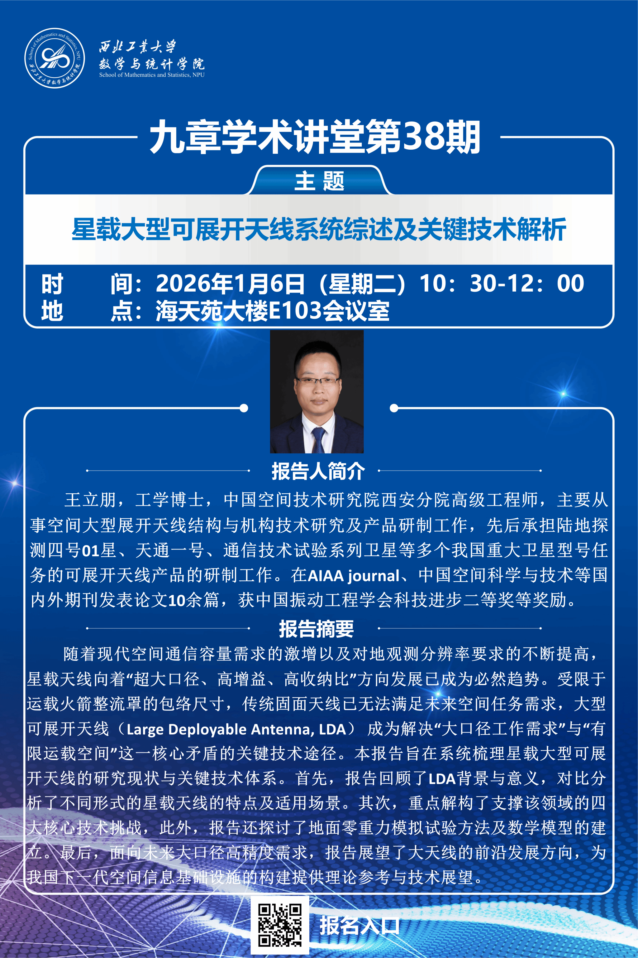 2026年1月6日上午,威尼斯人平台-威尼斯人娱乐城官网 第38期“九章学术讲堂”在海天苑大楼E103会议室成功举办。本期讲堂特邀中国空间技术研究院西安分院高级工程师、工学博士王立朋担任主讲,以“星载大型可展开天线系统综述及关键技术解析”为主题,为威尼斯人平台 相关专业师生带来一场聚焦航天工程前沿的深度分享。