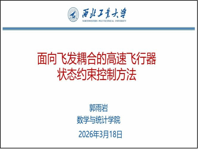 郭雨岩副教授以“面向飞发耦合的高速飞行器状态约束控制方法”为题作报告,介绍了在考虑高速飞行器发动机进气需求条件下的攻角约束与过载约束控制问题。报告系统阐述了飞发耦合特性与攻角约束问题,构建了飞行器姿态动力学模型,并在此基础上给出了基于两类障碍李雅普诺夫函数的控制器设计方法及闭环系统稳定性证明过程。通过数值仿真结果验证了方法的有效性。报告结束后,王俊刚教授与郭雨岩副教授围绕飞行控制算法的工程实现路径、非线性控制律设计依据以及控制理论与优化方法的融合等问题展开了深入交流,并就障碍李雅普诺夫函数与传统二次型李雅普诺夫函数在状态约束控制中的设计原理进行了探讨。